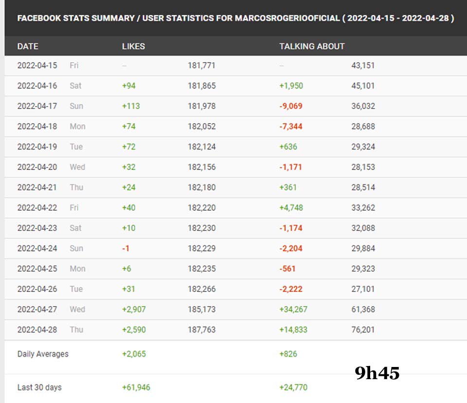Suas curtidas também saltaram no Facebook. No dia 24, domingo, ele perdeu um curtidor. Na segunda-feira, ganhou seis; na terça-feira, trinta e um. Quarta-feira teve um salto de 2,9 mil curtidas. E na quinta apresentou outras 2,5 mil curtidas.