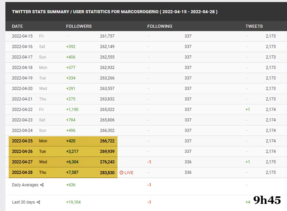 Na segunda, dia em que Elon Musk anunciou a compra do Twitter, Rogério ganhou 420 seguidores; na terça, 3,2 mil; na quarta, 6,3 mil e nesta quintas, outros 7,5 mil.