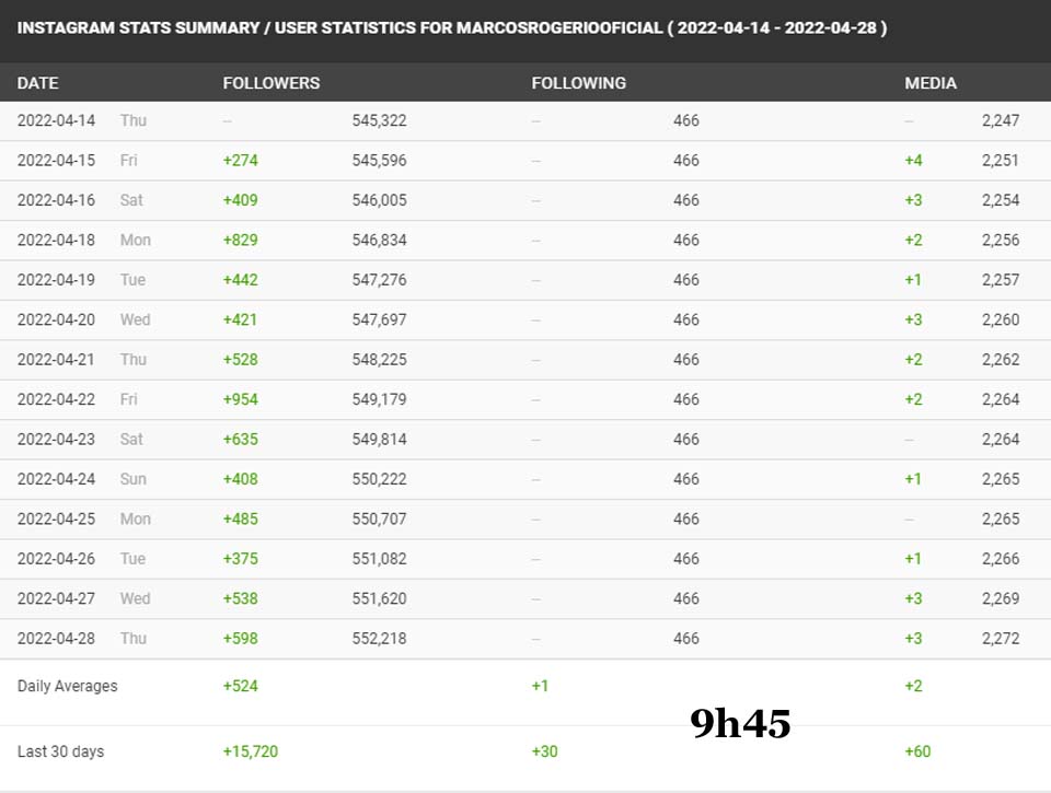 No Instagram o congressista conserva númeors positivos, mas não exponenciais, recebendo de 300 a 600 seguidores por dia, sem alterações exclusivas por conta da venda do Twitter.