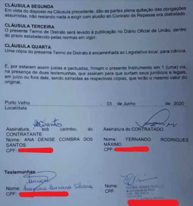 Ainda segundo o termo de distrato, uma cópia foi encaminhada ao Legislativo local para ciência. O Rondoniaovivo não conseguiu a informação se os deputados estaduais receberam reprodução do acordo que prevê a devolução do dinheiro, que já foi publicado no Diário Oficial da União (DOU).